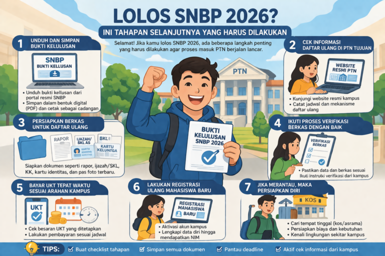 Categories SNBP, SNBT Tags Bukti Kelulusan SNBP, Cara Daftar Ulang SNBP, Daftar Ulang PTN, Lolos SNBP, mahasiswa baru, Registrasi SNBP, SNBP 2026, UKT Mahasiswa, Verifikasi Berkas SNBP Leave a comment