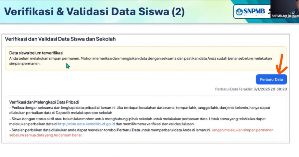 Setelah login, siswa wajib melakukan pengecekan data pribadi, validasi data siswa, dan pembaruan data jika diperlukan. Jika status data belum terverifikasi, silakan klik tombol “Perbarui Data”.